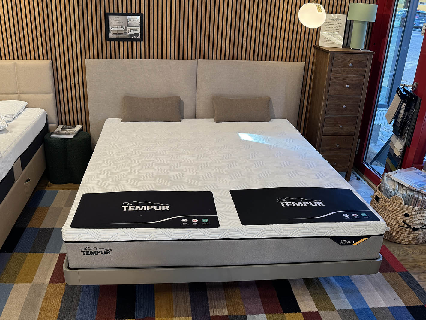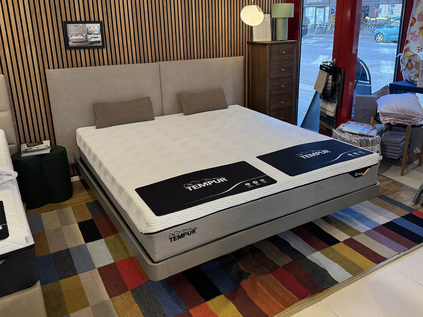 Italiensk Sengeramme i matlakeret metal stel, lamelbunde og polstret gavl med Tempur Medium / Firm Hybrid madras.
