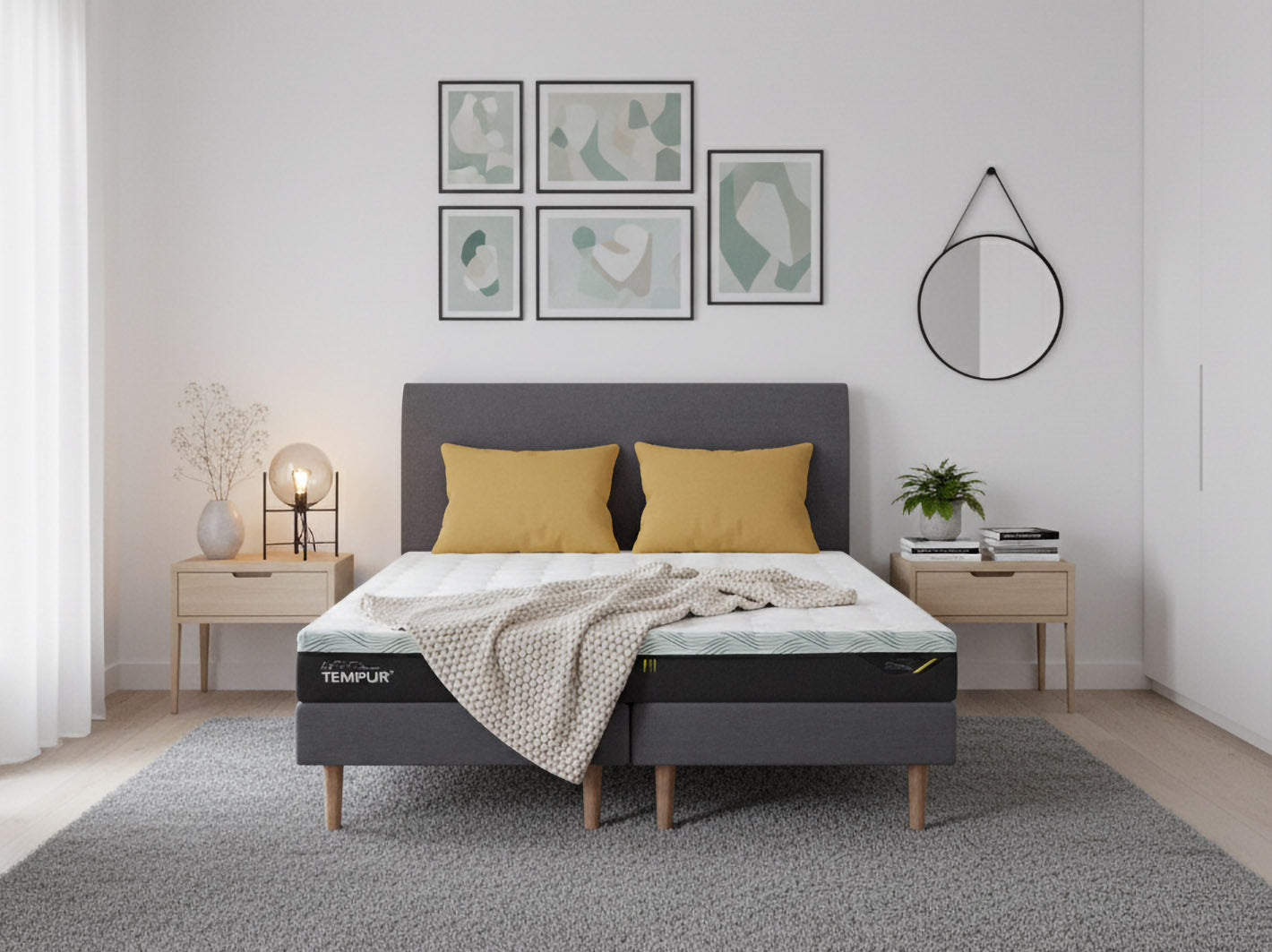 Tempur Pro Plus Cool Touch madras og Sawana Springbox i Light Grey samt Curve gavl.