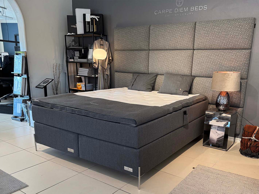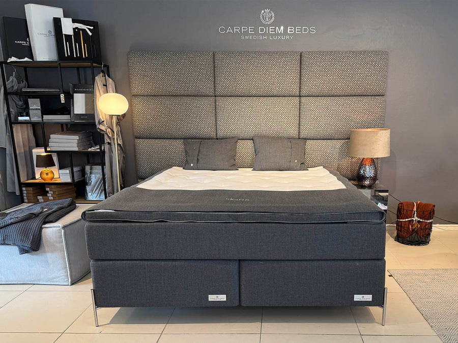 Komplet Carpe diem Skaftö kontinentalseng med Luxury topmadras - inkl. Skärgård gavl (4 x 3 paneler) som monteres på væg.
